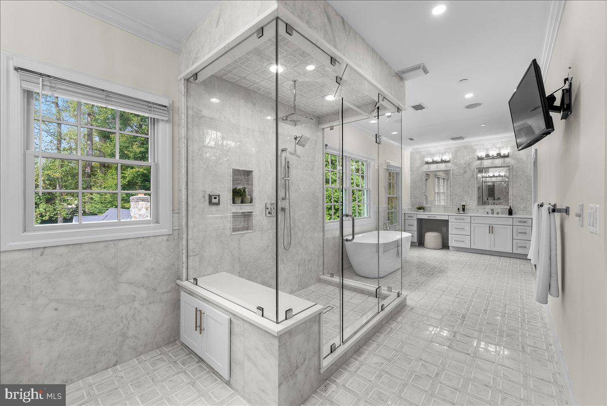The gourmet kitchen with a full suite of high-end appliances and large island connects with an eat-in breakfast table, adjacent to the great room with 11' ceilings, surrounding windows, and access to the screened-in porch. An elegant formal dining room adjacent to the living room and kitchen comfortably hosts more than 15 guests, with outside access onto the expansive rear slate terrace through French doors. The terrace overlooks the professionally landscaped grounds, an outdoor heated and saltwater pool with cover, and a complete guest/pool house with a living room, kitchenette, two bathrooms, a bedroom, and laundry - providing all living necessities. The primary bedroom on the second level of the main home spans the entirety of the rear and includes a sitting room, balcony, breakfast bar, custom walk-in closets and changing room, and a large bathroom space with a steam shower and soaking tub. Three other bedrooms with adjacent bathrooms are on the second level as well as a sitting room area and laundry room. The top level includes a private sitting room connecting to the fifth bedroom. The lower level offers an expansive area with walkout to the rear garden and having multiple spaces for everyday living; a kitchenette connecting to a large second family room with a gas fireplace, AuPair suite, exercise room, recreational room, home theater room, creative room, and storage space. A three-car attached garage enters into the mud room on the main level, with a vast amount of additional parking available around the wide circular driveway.