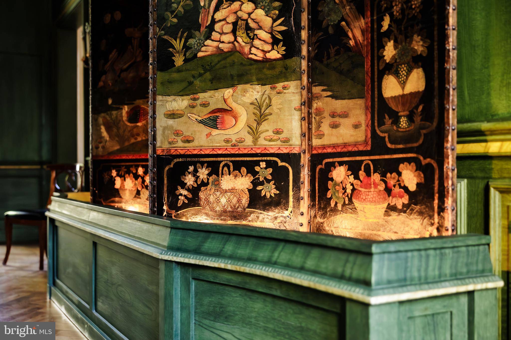 Stepping beneath the lofty portico and through arched double doors reveals the grand gallery, spanning the entire depth of the home. Hand-painted in a striking faux green finish by British artist Malcolm Robson to complement refinished herringbone floors, it sets the tone for the formal spaces. Soaring 11-foot ceilings, 8-foot solid mahogany doors, and elaborate P.E. Guérin hardware — including custom windows with crémone fittings — are testaments to the level of detail throughout.